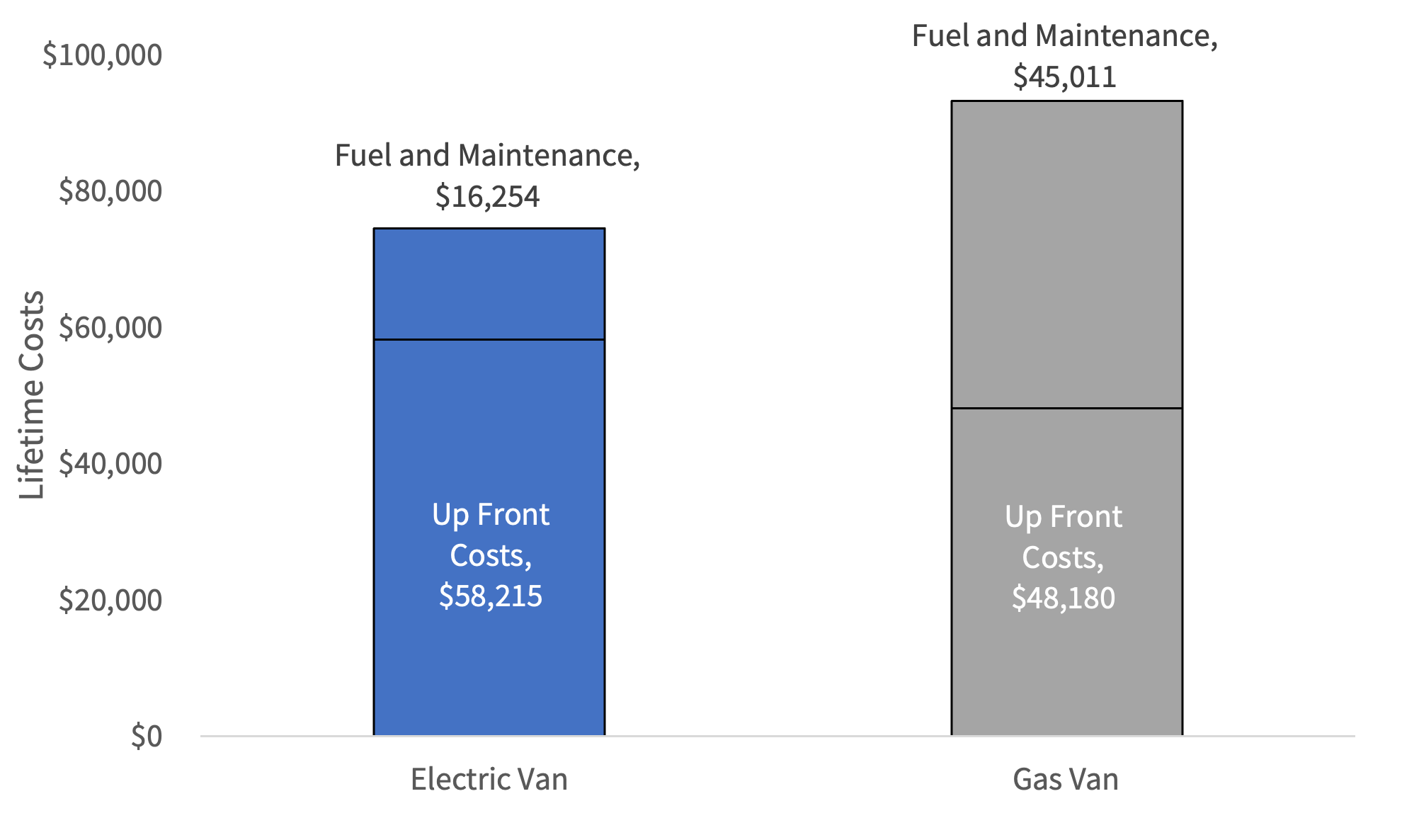 All in all, this leads the EV to reach a break-even point with the gasoline van in about 3 years and to create an estimated lifetime savings of nearly $19,000.