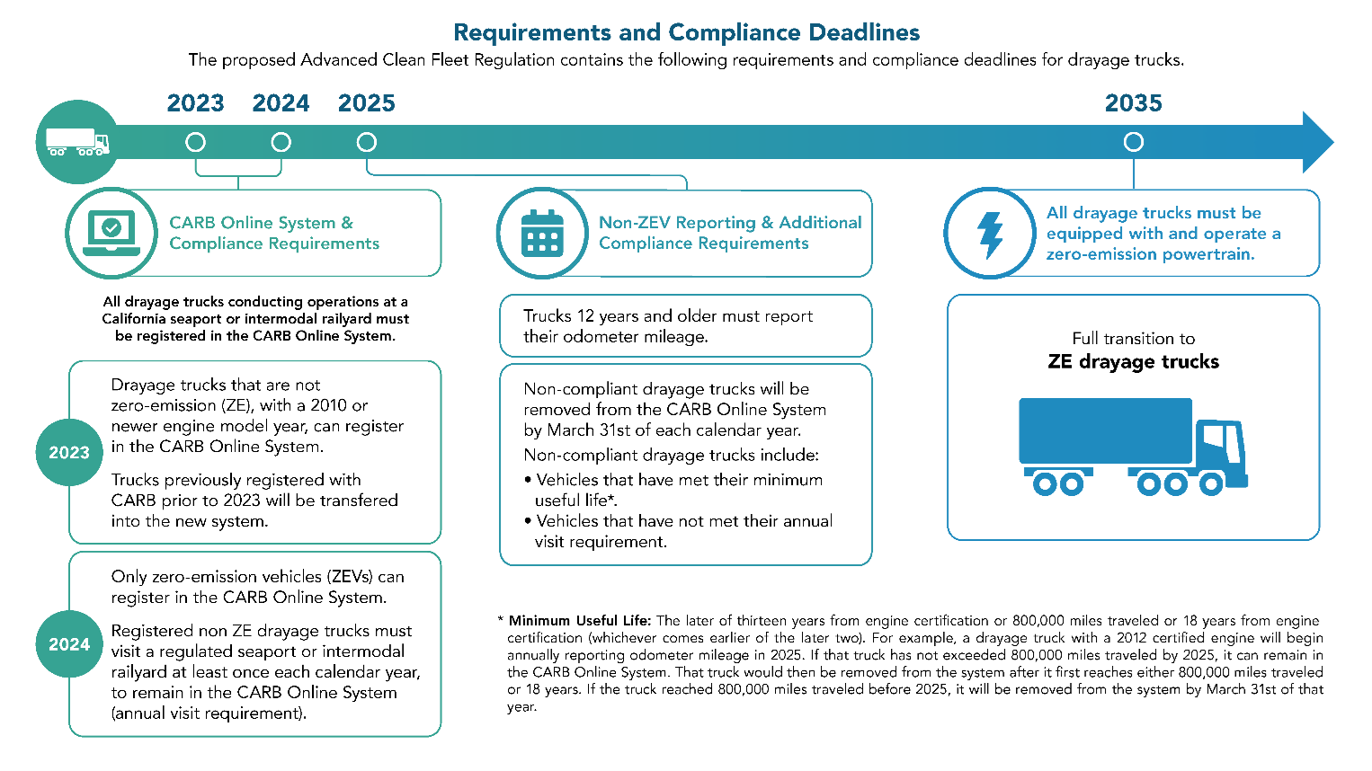 By January 1st, 2024, all drayage trucks must be registered in CARB’s Online System in order to do business in California. From that day on, only ZE drayage trucks will be allowed to register in the CARB Online System. Internal combustion engine (ICE) drayage trucks registered through December 31, 2023 will be allowed to operate through their minimum useful life.
