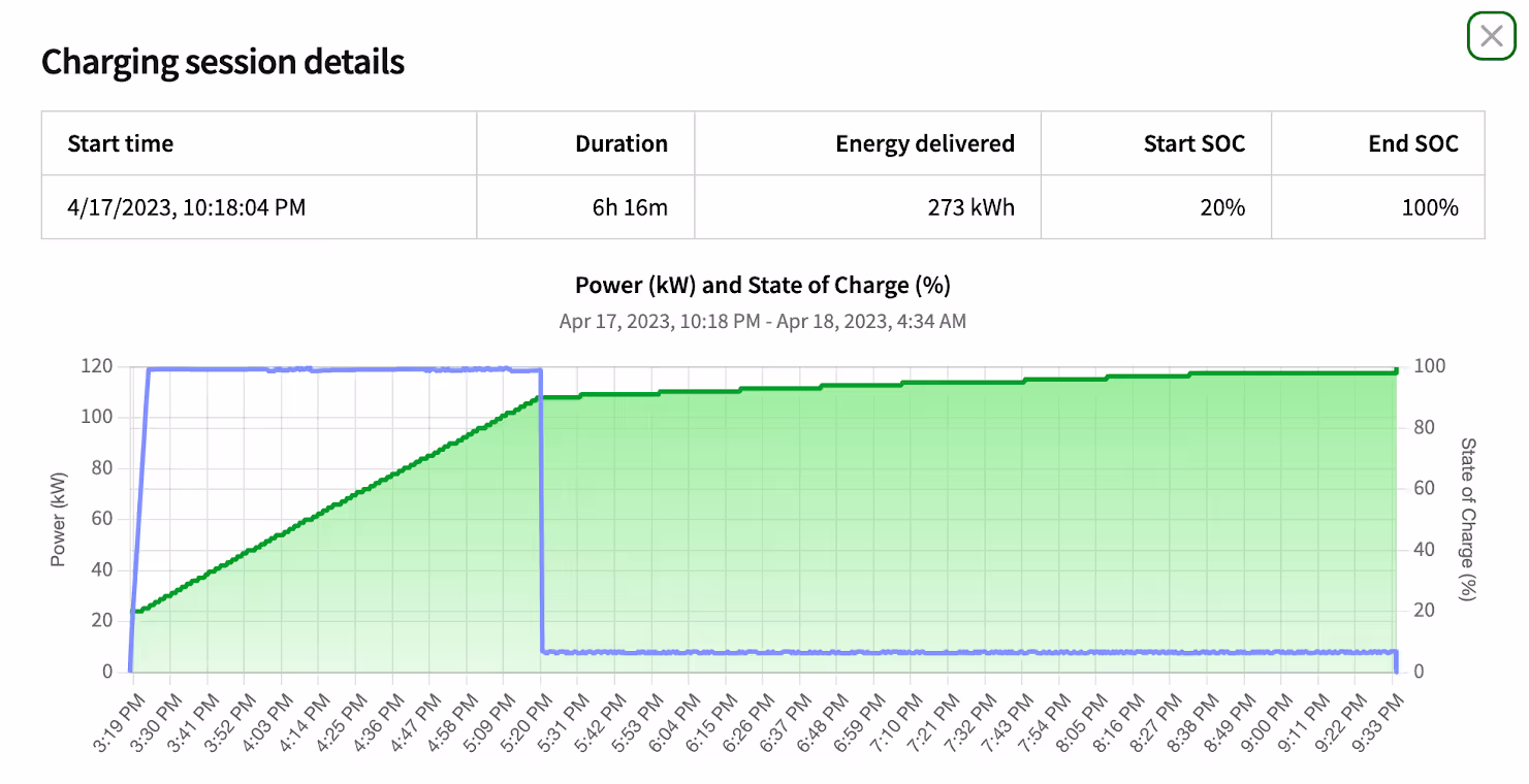 Flipturn Connect receives real-time data from charging stations on energy delivered within each charging session. We use this data to calculate costs from time of use fees with high accuracy, even if power use is often variable across the duration of the charging session, as shown below: