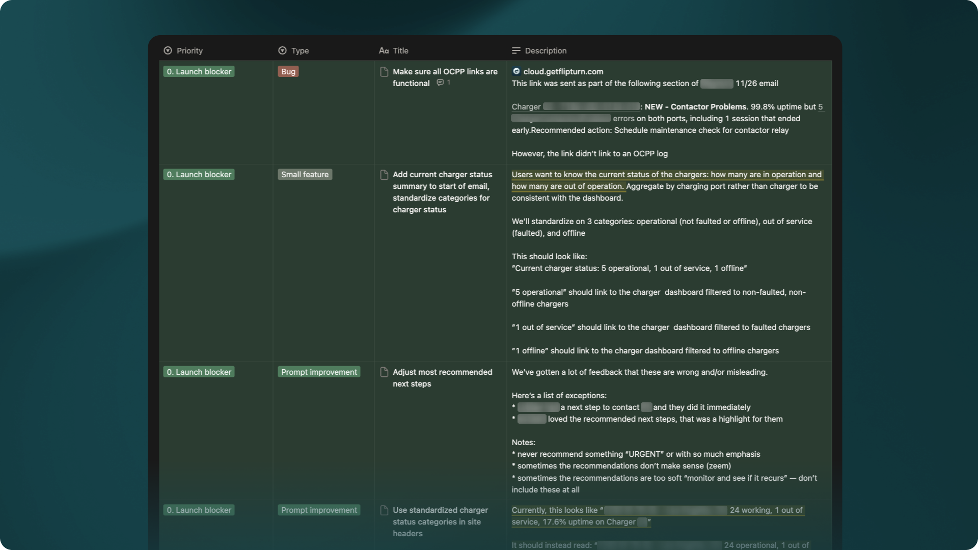 To make the report worth reading, we needed to understand what makes a good operational recap. We collected feedback from our customers to learn what data was most useful to them. Our team also triaged charger issues ourselves using the Flipturn platform, experiencing firsthand what operators face daily. We learned that: