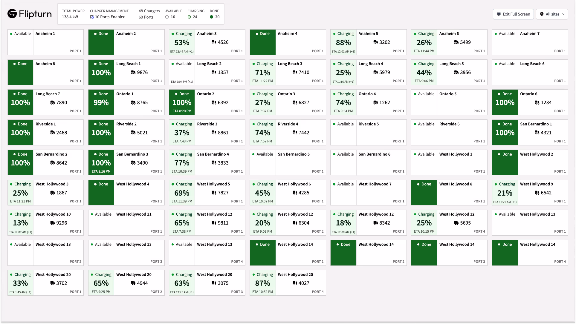 Additionally, we've introduced a full-screen mode which will hide the top bar and fit more ports on the screen. This view is great for setting this up on a TV in a driver lounge or depot office to keep an eye on all of your chargers, as many of our users do.