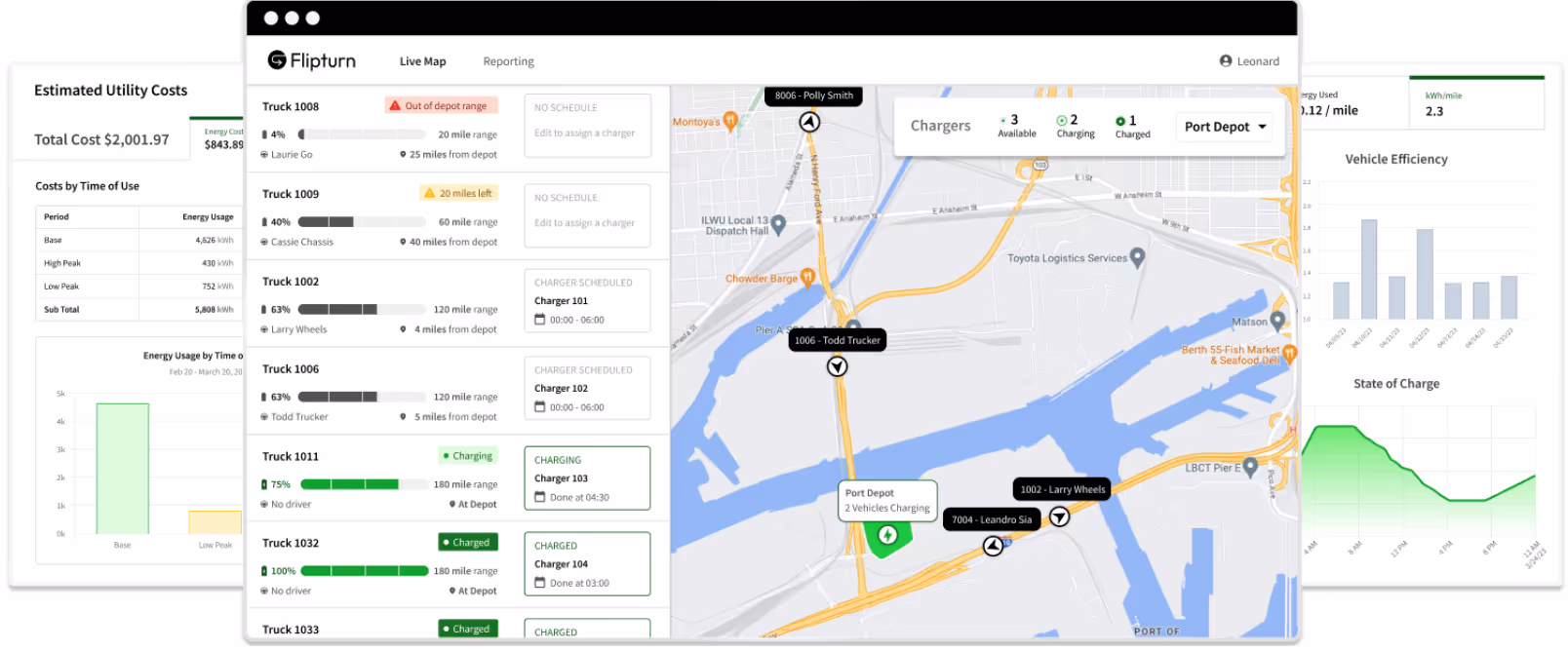 Flipturn Connect gives you cross-system visibility into your fleet EV and charger operations so you have all the data and insights you need to understand your fleet’s environmental impact, reduce costs, and maximize ROI. With Connect, you can monitor and manage your EV fleet in one place and use key data to make the right decisions faster, manage charging, cut energy costs, maximize utilization, and get the most out of your EVs.