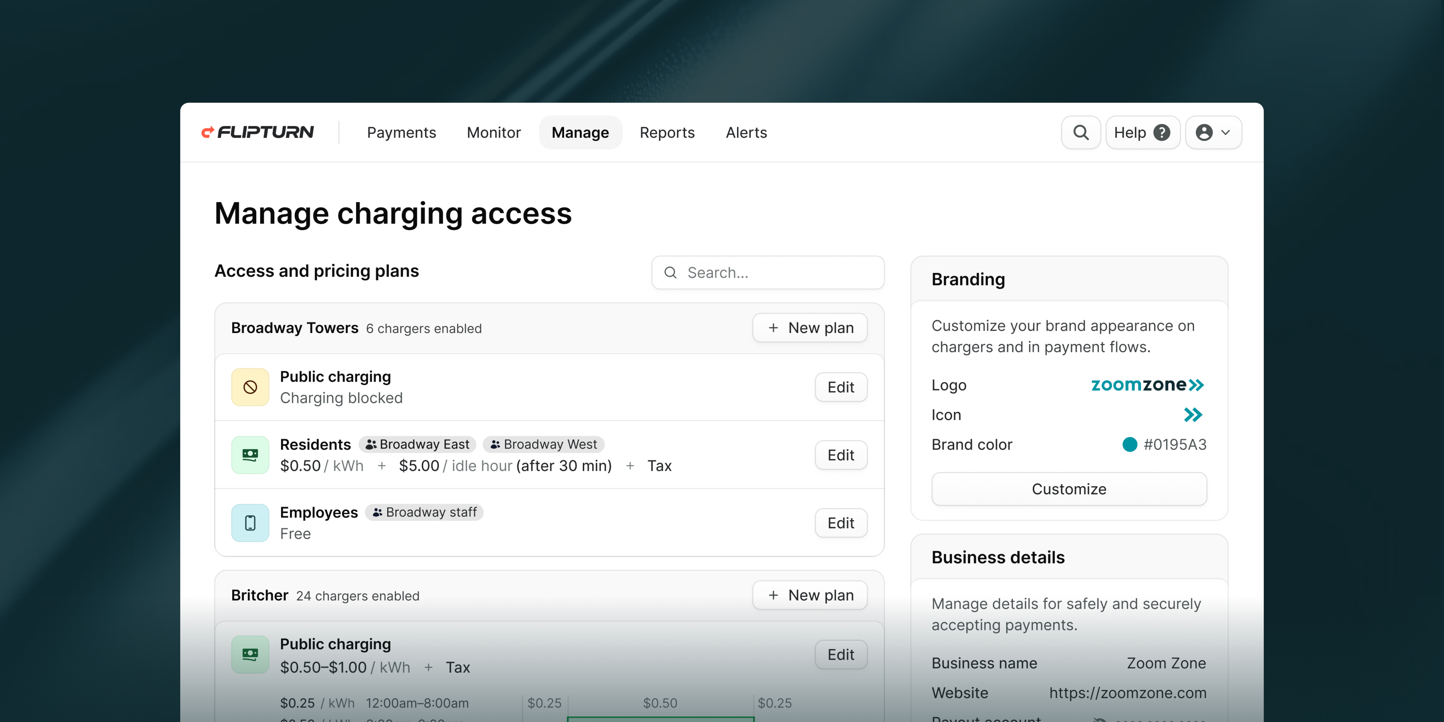 - Payments configuration: what drivers pay to charge, can vary by TOU (time-of-use) or be a flat-rate
